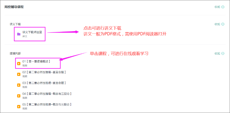 (4)聽課學(xué)習(xí):進(jìn)入聽課頁(yè)面,可下載電子講義,或單擊課程進(jìn)行在線觀看學(xué)習(xí)。
