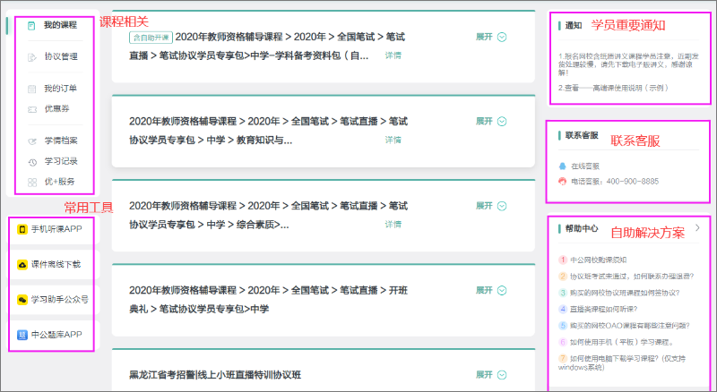 (1)登錄后默認(rèn)展示“我的課程”,中間區(qū)域顯示已經(jīng)開通的網(wǎng)課列表。