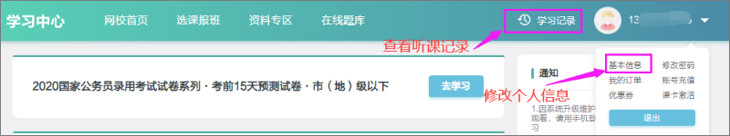 點(diǎn)擊右上角帳號(hào)▽,通過(guò)點(diǎn)擊“基本信息”可以修改個(gè)人信息(修改直播間昵稱,可通過(guò)修改“姓名”后重新登錄聽課中心),個(gè)人聽課記錄可以通過(guò)“學(xué)習(xí)記錄”點(diǎn)擊查看。
