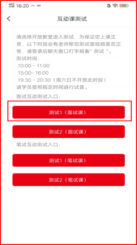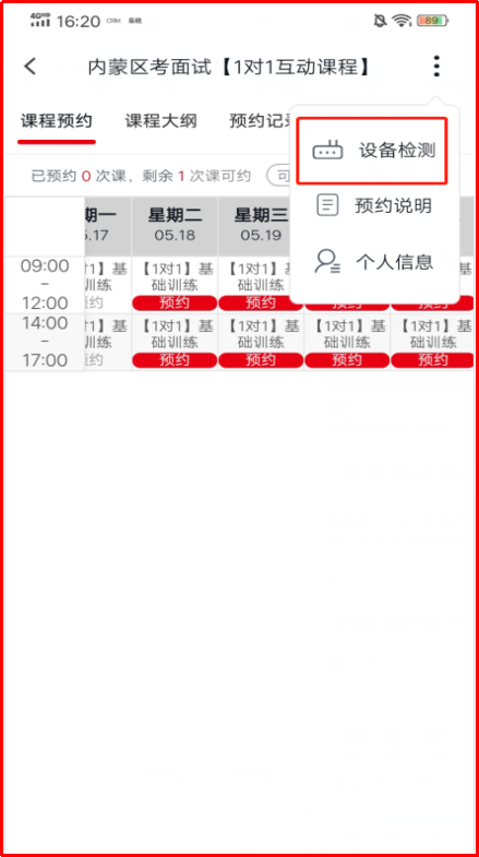 1.請(qǐng)點(diǎn)擊 "1對(duì)1互動(dòng)入口---右上角三個(gè)小點(diǎn)",選擇“設(shè)備檢測(cè)”進(jìn)入,然后點(diǎn)擊測(cè)試1(面試課)進(jìn)入后頁(yè)面顯示如下: