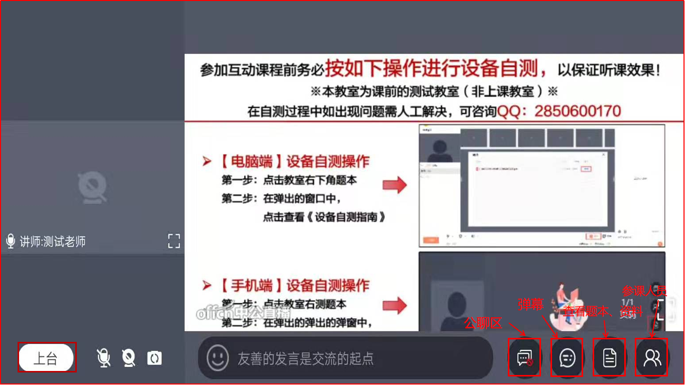 (1)操作:進(jìn)入教室后點(diǎn)擊下方公聊區(qū),發(fā)布文字,檢測(cè)是否能在公聊區(qū)打字(如個(gè)人網(wǎng)絡(luò)不好,不建議開啟視頻,會(huì)對(duì)您的語(yǔ)音音頻有一定的影響)。