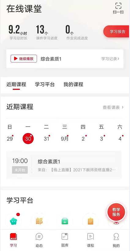 ? 學(xué)習(xí)平臺(tái):如顯示有小紅點(diǎn)標(biāo)記,表示有未處理的服務(wù)信息,需注意對(duì)應(yīng)進(jìn)行操作處理(如協(xié)議簽訂、自助開(kāi)課、課程預(yù)約等)。