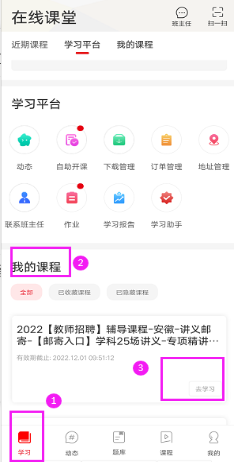 3查詢(xún)課程目錄 :進(jìn)入【學(xué)習(xí)】模塊,下滑頁(yè)面至“我的課程”展示已開(kāi)通課程,點(diǎn)擊對(duì)應(yīng)課程“去學(xué)習(xí)”,可查看該課程目錄,展開(kāi)目錄可查看講義或視頻進(jìn)行學(xué)習(xí)。