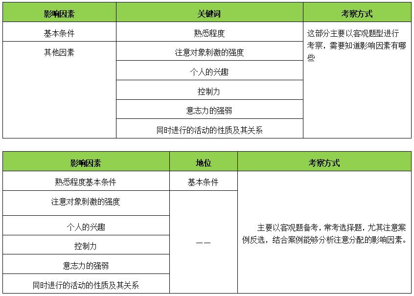 那么,問題又來了,注意分配的影響因素有哪些呢?在我們的考試中重要性如何?讓我們通過一個表格來了解一下吧!