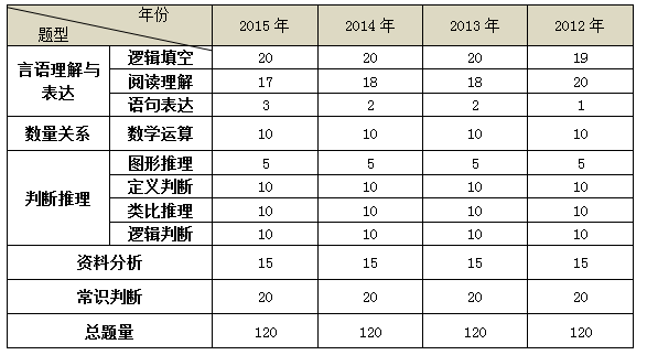 表:2012——2015年行測考試題型題量統(tǒng)計