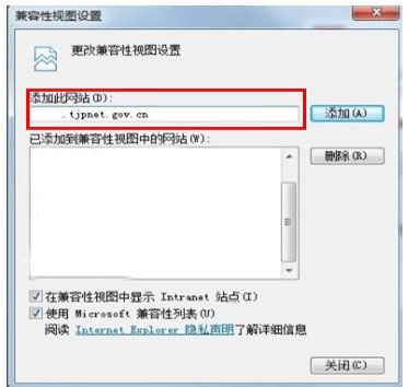 接著把天津市公開選調(diào)公務員或者公開遴選公務員報名的網(wǎng)站添加到兼容性視圖網(wǎng)站中去,如下圖所示