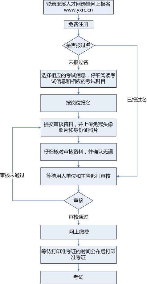 網(wǎng)絡(luò)報名的大致流程為:登錄玉溪人才網(wǎng)→網(wǎng)上報名入口→注冊→查看招聘崗位→按崗位報名并填寫報名資料→等待審核→審核通過→網(wǎng)上交費(fèi)(注意查看交費(fèi)狀態(tài),確認(rèn)交費(fèi))→打印筆試準(zhǔn)考證(打印時間在筆試公告內(nèi)另行通知)→參加筆試。