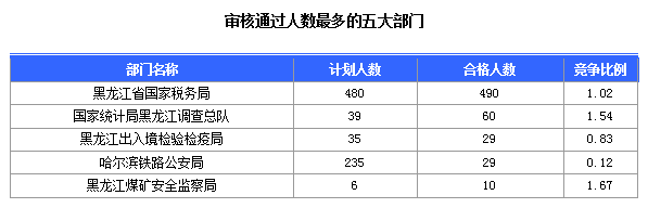 截止15日17時(shí),通過審核人數(shù)前三位的部門依次是:黑龍江省國(guó)家稅務(wù)局、國(guó)家統(tǒng)計(jì)局黑龍江調(diào)查總隊(duì)、黑龍江出入境檢驗(yàn)檢疫局,三部門通過審核總?cè)藬?shù)達(dá)579人,占通過審核總?cè)藬?shù)的91.9%。