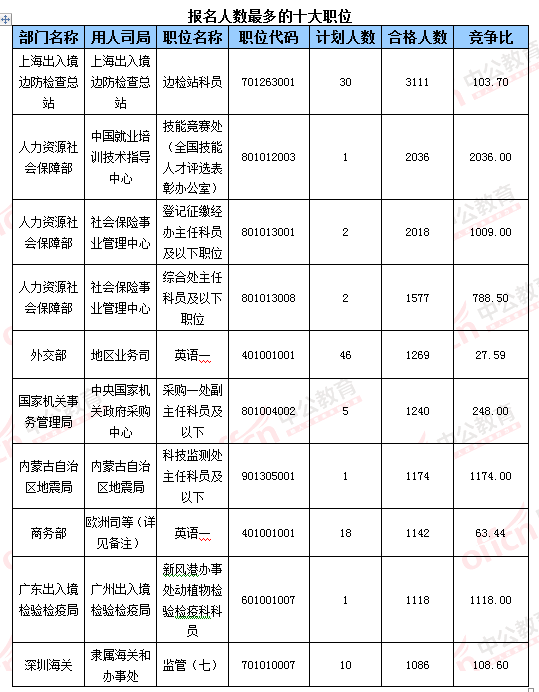 “人力資源社會部中國就業(yè)培訓(xùn)技術(shù)指導(dǎo)中心”職位競爭比2000:1,是第二名“內(nèi)蒙古自治區(qū)地震局”職位的兩倍。隨著報(bào)名截止時(shí)間的臨近,該職位會成為本年度國考熱度職位無疑!