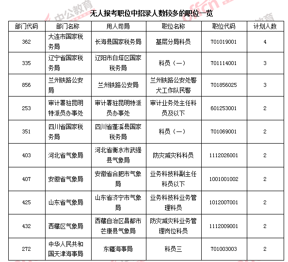 截止到24日9時30分,共有15440個職位有考生通過審核,占總職位數(shù)的98.6%,目前仍有219個崗位報考人數(shù)還未破零,約占1.4%。從各系統(tǒng)無人報考情況看,目前中央黨群機關(guān)、中央黨群機關(guān)參照公務(wù)員法管理人民團體和群眾團體系統(tǒng)、中央黨群機關(guān)參照公務(wù)員法管理事業(yè)單位三個系統(tǒng)的所有職位已經(jīng)全部有人過審。中央國家行政機關(guān)(本級)也僅僅只剩下2個職位無人過審,其中1個來自審計署, 1個來自國家外國專家局。目前就中央國家行政機關(guān)省級以下直屬機構(gòu)無人報考職位比較多,還有118個職位,這些職位多來自于稅務(wù)局、檢驗檢疫局、海關(guān)、海事局等。
