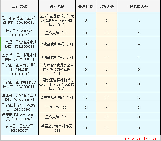 截至11日16時(shí),淮安市報(bào)名人數(shù)最多的職位為:區(qū)城市管理行政執(zhí)法大隊(duì)執(zhí)法隊(duì)員(參公管理) [01]、稅收征管辦事員 [01]、稅收征管辦事員 [02]、工作人員 [09],分別有4人報(bào)名,競爭最激烈的職位為工作人員 [09],招錄1人,報(bào)名人數(shù)為4人,報(bào)名通過審核人數(shù)前十的職位主要集中在淮安市清浦區(qū)-區(qū)城市管理局 [3081100021]、漣水縣-淮安市漣水地稅局 [5082600026],具體信息如下: