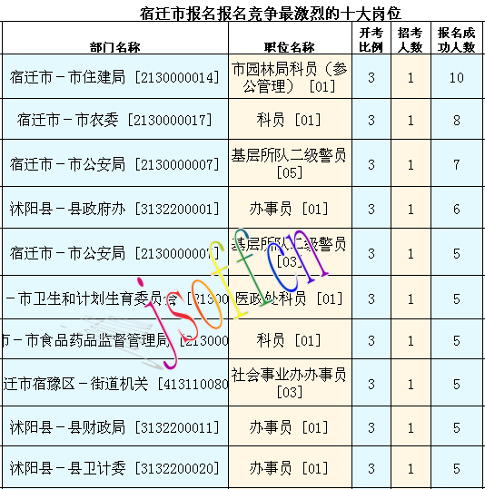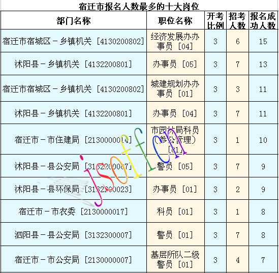 截至12日15時(shí)53分,宿遷市報(bào)名人數(shù)最多的職位為:宿遷市宿城區(qū)-鄉(xiāng)鎮(zhèn)機(jī)關(guān) [4130200802],一共有15人報(bào)名,競(jìng)爭(zhēng)最激烈的職位為市園林局科員(參公管理) [01],招錄1人,報(bào)名人數(shù)為10人,報(bào)名通過(guò)審核人數(shù)前十的職位主要集中在宿遷市宿城區(qū)-鄉(xiāng)鎮(zhèn)機(jī)關(guān) [4130200802]、沭陽(yáng)縣-鄉(xiāng)鎮(zhèn)機(jī)關(guān) [4132200801],具體信息如下: