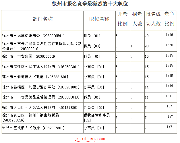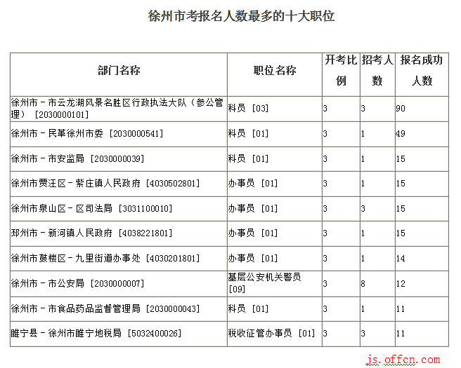 截至12日16時,徐州市報名人數(shù)最多的職位為:科辦員 [03],一共有90人報名,競爭最激烈的職位為科辦員 [03],招錄3人,報名人數(shù)為90人,報名通過審核人數(shù)前十的職位主要集中在徐州市-市云龍湖風(fēng)景名勝區(qū)行政執(zhí)法大隊(參公管理)[2030000101]、徐州市-民革徐州市委 [2030000541],具體信息如下: