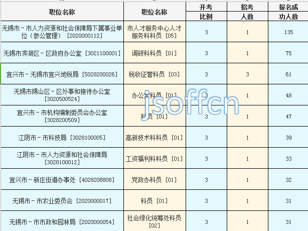 截至14日16時,無錫市報名人數(shù)最多的職位為:無錫市-市人力資源和社會局下屬事業(yè)單位(參公管理) [2020000112],市人才服務(wù)中心人才服務(wù)科科員 [05],一共有135人報名,報名通過審核人數(shù)前五的職位主要集中在: 無錫市-市人力資源和社會局下屬事業(yè)單位(參公管理) [2020000112]、無錫市濱湖區(qū)-區(qū)政府辦公室 [3021100001]、宜興市-無錫市宜興地稅局 [5028200026]、無錫市錫山區(qū)-區(qū)外事和接待辦公室 [3020500524]、宜興市-市機構(gòu)編制委員會辦公室 [3028200509]等十大職位,截止今天報名最多和競爭最激烈的職位依然是無錫市-市人力資源和社會局下屬事業(yè)單位(參公管理) [2020000112],多個職位報名人數(shù)十位數(shù),但依然有23個職位無人報名。