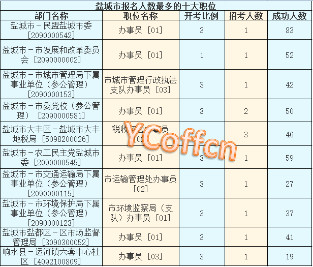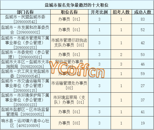 截至15日16時(shí),鹽城市報(bào)名人數(shù)最多的職位為:辦事員 [01],一共有60名,競(jìng)爭(zhēng)最激烈的職位為辦事員 [01],招錄1人,報(bào)名人數(shù)為83,報(bào)名通過(guò)審核人數(shù)前十的職位主要集中在在鹽城市-市發(fā)展和改革委員會(huì) [2090000002]、鹽城市-市城市管理局下屬事業(yè)單位(參公管理) [2090000153]、鹽城市-市委黨校(參公管理) [2090000581],具體信息如下: