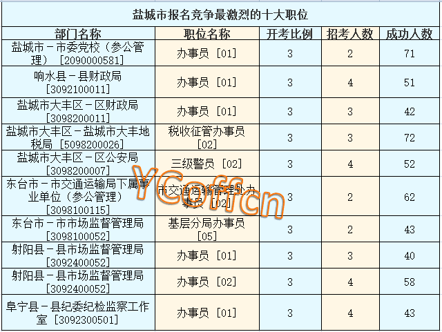 截至16日16時,鹽城市報名人數(shù)最多的職位為:鹽城市-明盟鹽城市委-辦事員 [01],一共有118名,競爭最激烈的職位為鹽城市-市委黨校辦事員 [01],招錄2人,報名人數(shù)為71,報名通過審核人數(shù)前十的職位主要集中在在鹽城市-市發(fā)展和改革委員會 [2090000002]、鹽城市-市城市管理局下屬事業(yè)單位(參公管理) [2090000153]、鹽城市-市委黨校(參公管理) [2090000581]