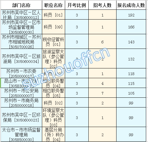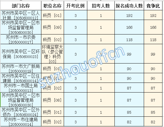 截至16日16時,蘇州市報名人數(shù)最多的職位為:蘇州市吳中區(qū)-區(qū)人社局科員 [01],一共有192人報名,競爭最激烈的職位也是蘇州市吳中區(qū)-區(qū)人社局科員 [01],招錄1人,報名人數(shù)為192人,報名通過審核人數(shù)前十的職位主要集中在蘇州市吳中區(qū)-區(qū)人社局 [3050600012]、蘇州市吳中區(qū)-區(qū)市場監(jiān)督管理局 [3050600030]、蘇州市相城區(qū)-蘇州市相城地稅局 [5050700026]、蘇州市吳中區(qū)-區(qū)旅游局 [3050600034]等部門,具體信息如下: