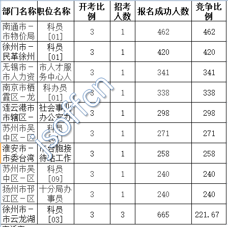截至17日16時,江蘇省報名人數(shù)最多的職位為:南京市-市公安局 [2010000007]、基層公安機關(guān)相應(yīng)職務(wù)警員 [03],一共有703人報名,競爭最激烈的職位為南通市-市物價局 [2060000048] 、科員 [01],招錄1人,報名人數(shù)為462人,報名通過審核人數(shù)前十的職位主要集中在南京市公安局、南通市物價局、徐州市-市云龍湖風(fēng)景名勝區(qū)行政執(zhí)法大隊等部門,具體信息如下: