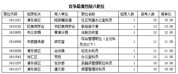 另據(jù)中公網(wǎng)校專家統(tǒng)計(jì),目前共有267個職位的報(bào)考比例已經(jīng)達(dá)到(或超過了)1:3,中公網(wǎng)校專家建議報(bào)考這些職位的考生要謹(jǐn)慎報(bào)考,結(jié)合自己的分?jǐn)?shù)多斟酌斟酌。其中,浦東新區(qū)陸家嘴街道社區(qū)黨建辦公室科員這一職位僅招錄1人,已有15人報(bào)名,位居競爭榜之首。在競爭比超過10:1的八個職位中,有4個來自浦東新區(qū),浦東新區(qū)的程度可見一斑。