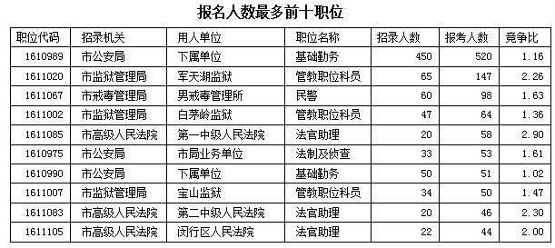 截至16日17時,實(shí)際申報(bào)人數(shù)最多的職位仍為市公安局下屬單位的基礎(chǔ)勤務(wù)一職,此職位招錄450人,目前實(shí)際申報(bào)人數(shù)為520人,與昨天同時沒有變化,目前此職位尚未達(dá)到1:3的面試比例,中公網(wǎng)校專家建議符合條件的考生不要被520的數(shù)字嚇到,還可以大膽放心地報(bào)。