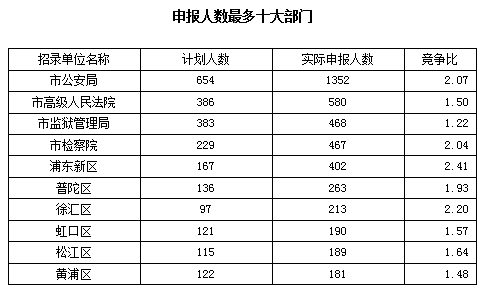 為幫助廣大考生更清晰的了解今日報名情況,中公網(wǎng)校整理了實(shí)際申報人數(shù)前十位的部門以及競爭比例最激烈的十大部門,供廣大考生參考: