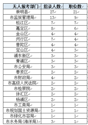 截止到19日18時報名結束,共有83個職位無人申報,占總職位數的4.9%,與去年同期基本持平。據中公網校統(tǒng)計,崇明縣無人申報職位最多,有21個職位無人申報,另外,市監(jiān)獄管理局、松江區(qū)、嘉定區(qū)等無人報考職位也較多。以下是各部門無人報考情況一覽: