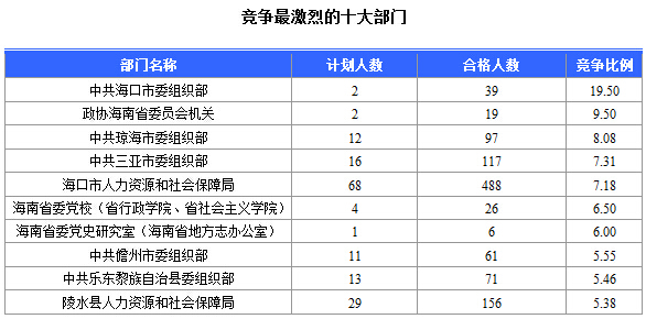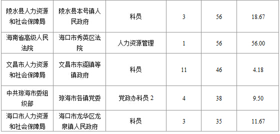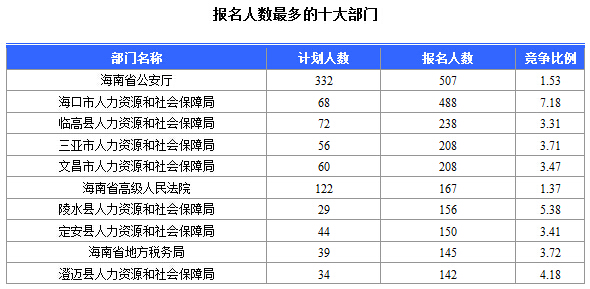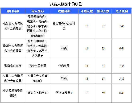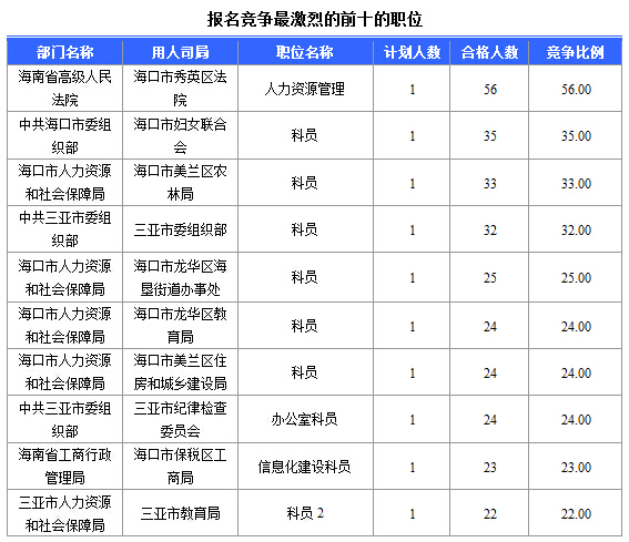 報(bào)名通過審核人數(shù)前十的職位主要集中在海南省高級(jí)人民法院、??谑腥肆Y源和社會(huì)局、海南省林業(yè)廳,具體信息如下: