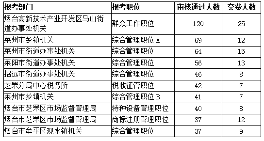 截止3月25日,煙臺公務員考試報考部門報考審核通過人數(shù)最多的崗位依次為:煙臺高新技術產(chǎn)業(yè)開發(fā)區(qū)馬山街道辦事處機關、萊州市鄉(xiāng)鎮(zhèn)機關、萊州市街道辦事處機關、萊陽市街道辦事處機關、招遠市街道辦事處機關、芝罘分局中心稅務所、萊州市鄉(xiāng)鎮(zhèn)機關、煙臺市芝罘區(qū)市場監(jiān)督管理局、煙臺市芝罘區(qū)市場監(jiān)督管理局、煙臺市牟平區(qū)觀水鎮(zhèn)機關。
