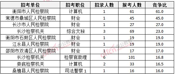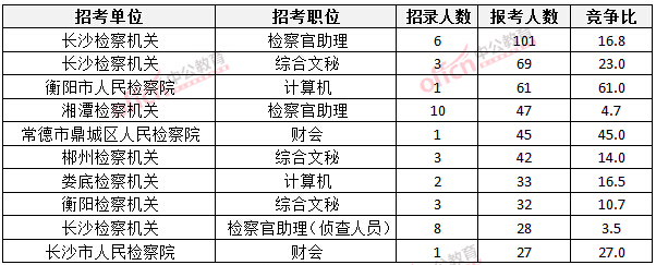 為幫助廣大考生更清晰的了解報(bào)名情況,湖南中公網(wǎng)校整理了湖南檢察院系統(tǒng)各職位的報(bào)名人數(shù)排名以及競(jìng)爭(zhēng)比例排名,供廣大考生參考: