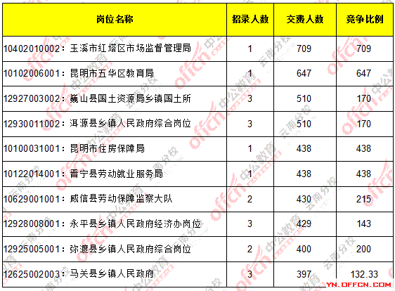 截止3月23日17時(shí),招錄比例的職位為10402010002:玉溪市紅塔區(qū)市場(chǎng)監(jiān)督管理局,招錄1人,截止23日17時(shí)繳費(fèi)人數(shù)為 709人,具體信息如下:
