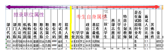仔細研究不難發(fā)現(xiàn),國考職位表的設(shè)置是具有高度科學性的,合理有序。前面幾列是招錄職位本身的性質(zhì),如部門名稱、職位名稱、部門代碼、職位代碼、機構(gòu)性質(zhì)、機構(gòu)層級、職位屬性、職位簡介、考試類別、招錄人數(shù)等;后面幾列是對考生的要求,如考生的專業(yè)、學歷、學位、政治面貌、基層工作經(jīng)驗、是否是“四項目人員”等。既然知道了這個職位表布局原理,我們就能更好地入手“多快好省”地找到適合自己的職位了。
