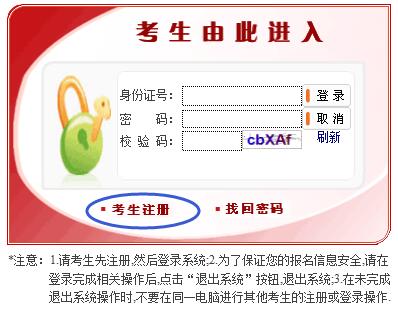 點擊進去之后會轉(zhuǎn)入到登錄及注冊頁面,首先點擊“考生注冊”進入注冊頁面。