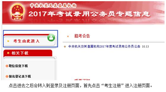 首先打開中央機關(guān)及其直屬機構(gòu)2017考試錄用公務(wù)員專題信息網(wǎng)頁http://bm.scs.gov.cn/2017/UserControl/Student/StudentIndex.aspx,點擊“考生由此進入”