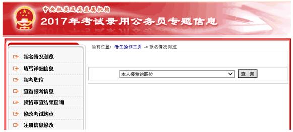 第二步:進(jìn)入錄用系統(tǒng)界面考生操作主頁之后,點(diǎn)擊右上角“報(bào)名情況瀏覽”按鈕進(jìn)入報(bào)名情況瀏覽頁面。