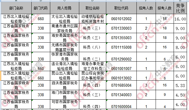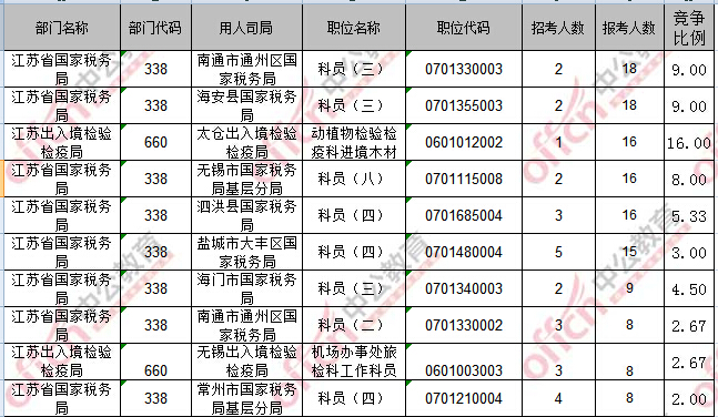 報名通過審核人數(shù)前十的職位主要集中在江蘇省國家稅務(wù)局、江蘇出入境檢驗檢疫局部門,具體信息如下: