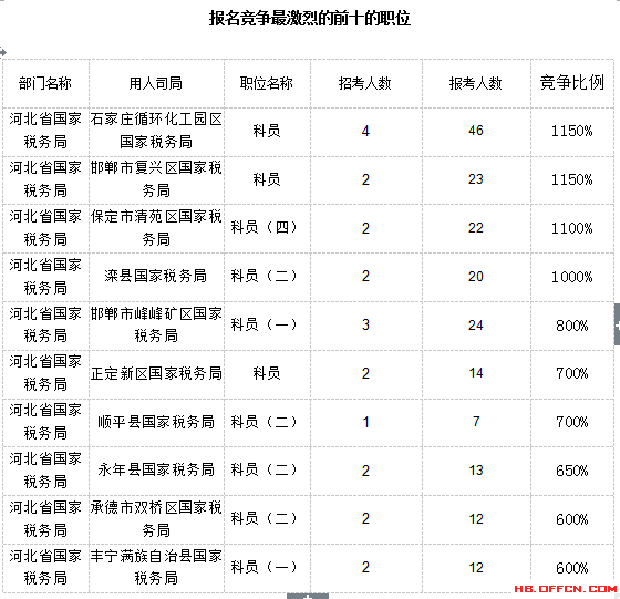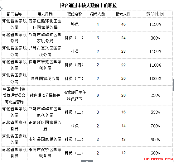 報名通過審核人數(shù)前十的職位主要集中在河北省國家稅務(wù)局、中國銀行業(yè)監(jiān)督管理委員會河北監(jiān)管局、中央辦公廳等部門,具體信息如下: