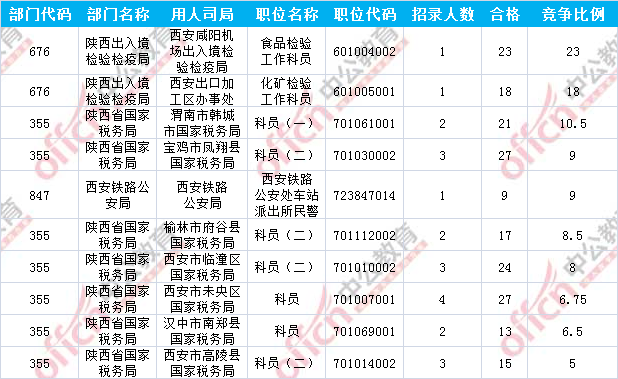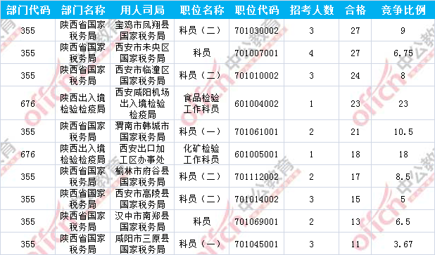 報名通過審核人數(shù)前十的職位主要集中在陜西省國家稅務(wù)局以及陜西出入境檢驗檢疫局這兩個部門,具體信息如下: