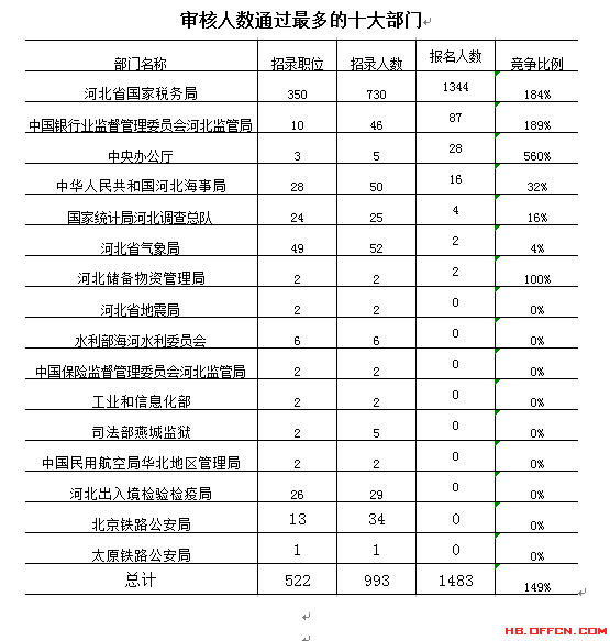 截止到16日8時,通過審核人數(shù)前三位的部門依次是:河北省國家稅務局、中國銀行業(yè)監(jiān)督管理委員會河北監(jiān)管局、中央辦公廳,三部門通過審核總人數(shù)達1459人,占通過審核總人數(shù)的98.3%。