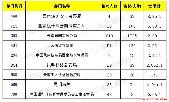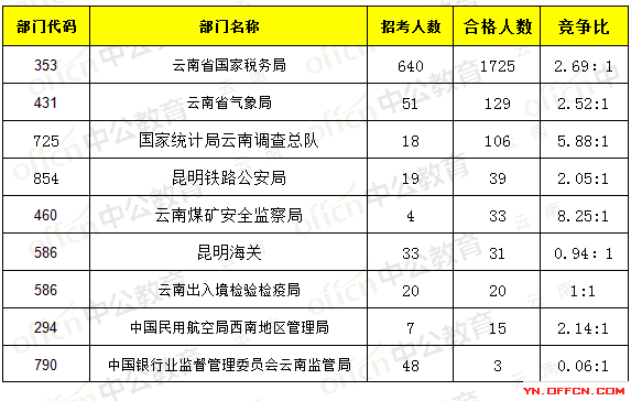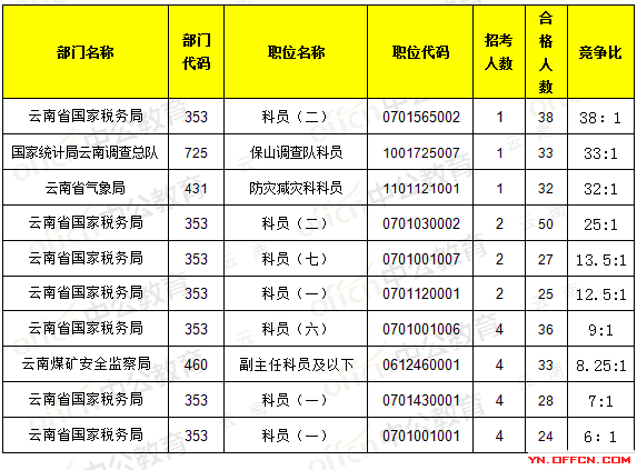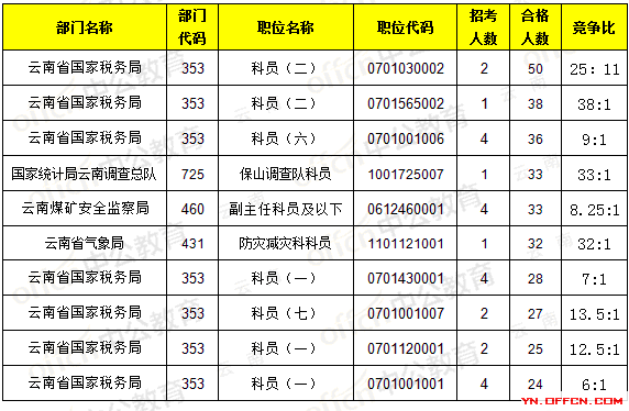 報名通過審核人數(shù)前十的職位主要集中在云南省國家稅務(wù)局、云南煤礦安全監(jiān)察局,具體信息如下: