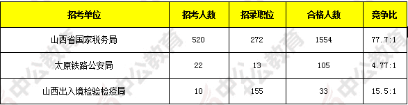 報(bào)考人數(shù)前十位的職位主要集中在山西省國(guó)家稅務(wù)局、山西出入境檢驗(yàn)檢疫局、太原鐵路公安等部門(mén),具體信息如下: