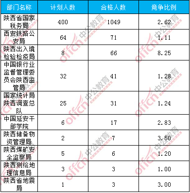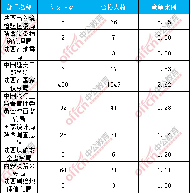 為幫助廣大考生更清晰的了解今日?qǐng)?bào)名情況,陜西中公網(wǎng)校整理了審核通過(guò)人數(shù)前幾位的部門(mén)以及競(jìng)爭(zhēng)比例最激烈的幾大部門(mén),供廣大考生參考: