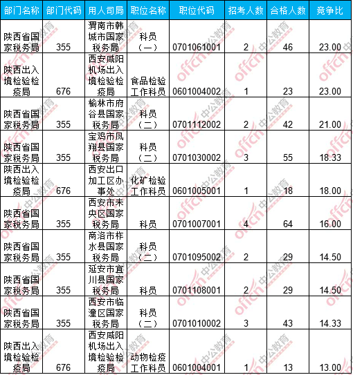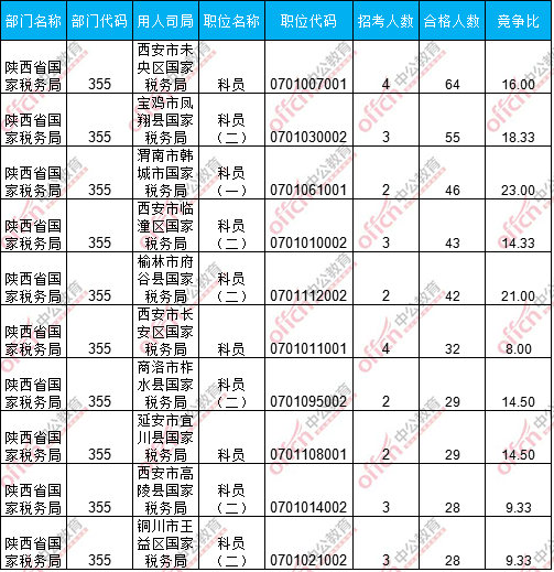 報(bào)名通過(guò)審核人數(shù)前十的職位主要集中在陜西省國(guó)家稅務(wù)局以及陜西出入境檢驗(yàn)檢疫局這兩個(gè)部門(mén),具體信息如下: