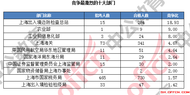 為幫助廣大考生更清晰的了解今日?qǐng)?bào)名情況,上海中公網(wǎng)校整理了審核通過人數(shù)前十位的部門以及競(jìng)爭(zhēng)比例最激烈的十大部門,供廣大考生參考: