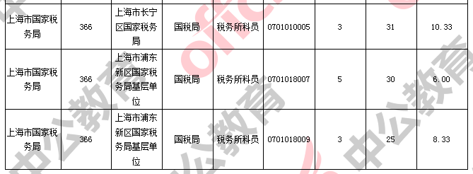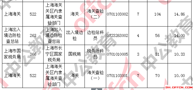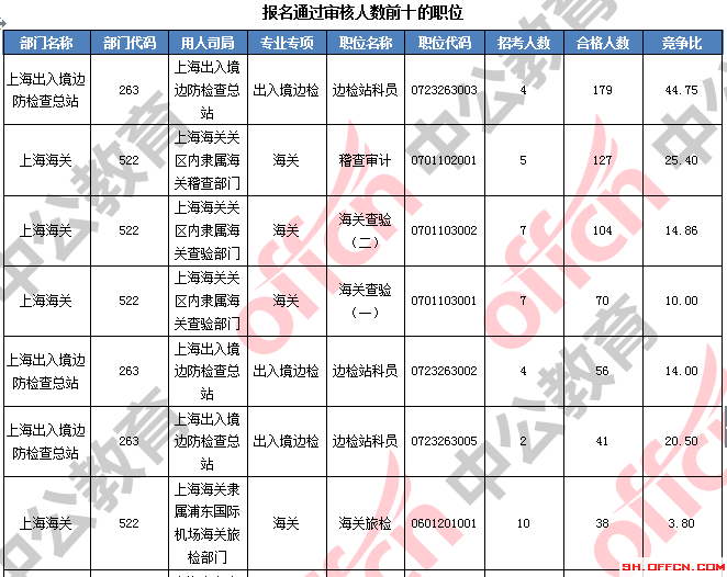 報名通過審核人數(shù)前十的職位主要集中在上海出入境邊防檢查總站、上海海關、上海市國家稅務局,具體信息如下:
