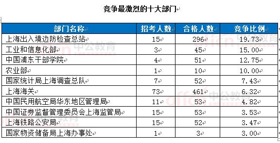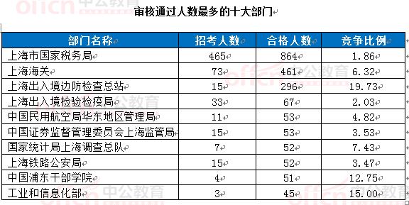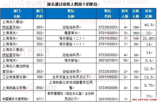 報(bào)名通過審核人數(shù)前十的職位主要集中在上海出入境邊防檢查總站、上海海關(guān)、工業(yè)和信息化部等部門,具體信息如下: