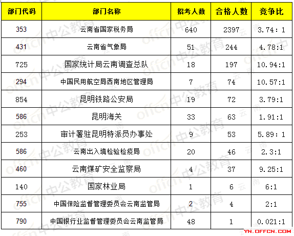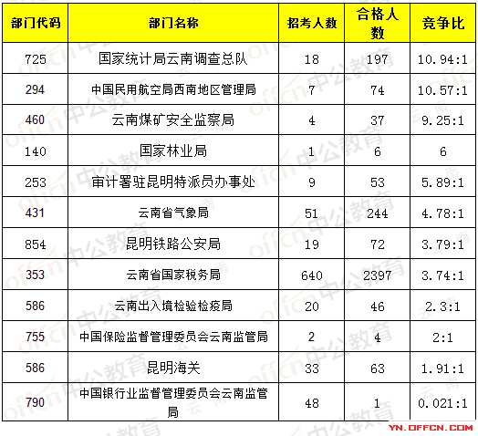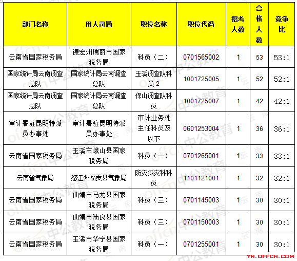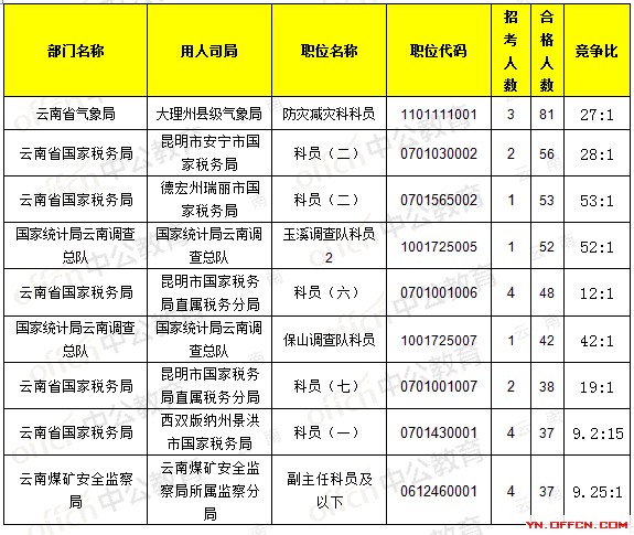 報(bào)名通過審核人數(shù)前十的職位主要集中在云南省國家稅務(wù)局、云南煤礦安全監(jiān)察局,具體信息如下: