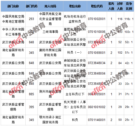 截止到10月17日8時(shí),報(bào)名通過審核人數(shù)和競爭比例的職位為中國民用航空湖北安全監(jiān)督管理局機(jī)場處機(jī)場運(yùn)行監(jiān)察科員一職,招錄1人,過審人數(shù)116人,競爭比例為116:1。具體信息如下: