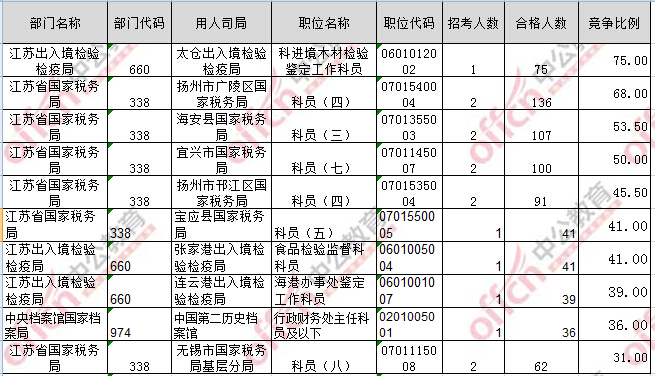 截止到17日8時(shí),競(jìng)爭(zhēng)比例的職位為江蘇出入境檢驗(yàn)檢疫局太倉(cāng)出入境檢驗(yàn)檢疫局動(dòng)植物檢驗(yàn)檢疫科進(jìn)境木材檢驗(yàn)鑒定工作科員一職,招錄1人,截止到17日8時(shí)通過(guò)人數(shù)為75人。