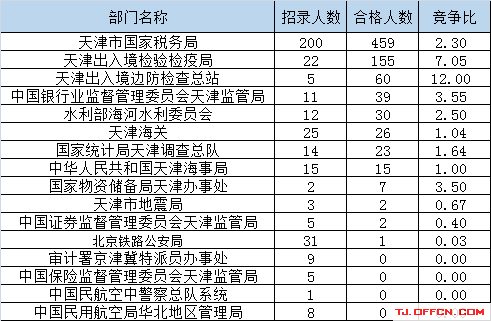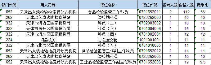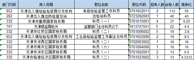 報名通過審核人數(shù)前十的職位主要集中在天津出入境檢驗檢疫局分支機(jī)構(gòu)、天津出入境邊防檢查總站、天津市薊縣國家稅務(wù)局,具體信息如下: