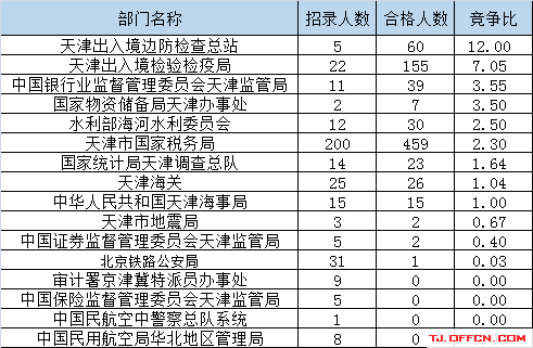 截止到17日8時,競爭比例的職位為天津出入境檢驗檢疫局分支機(jī)構(gòu)食品檢驗監(jiān)管工作科員一職,招錄2人,截止到17日8時通過人數(shù)為112人。